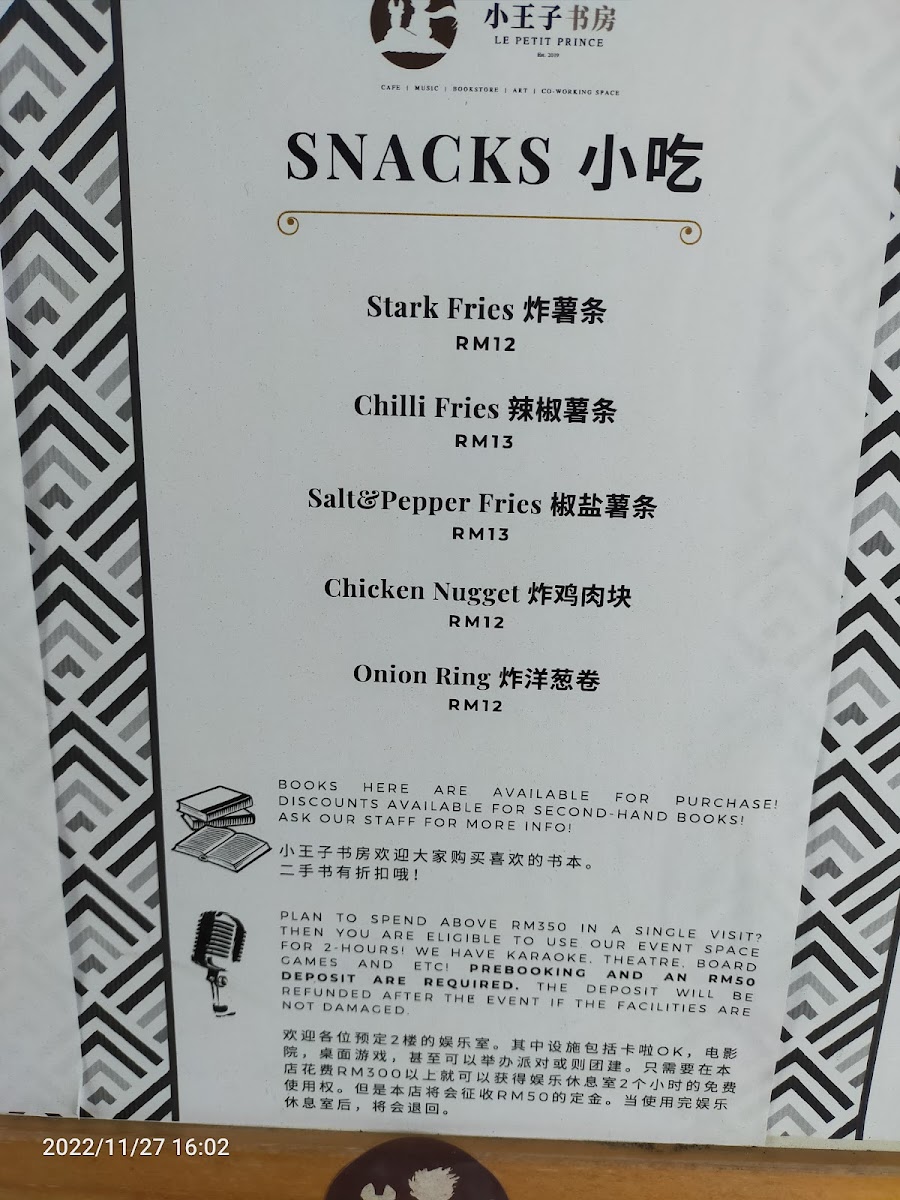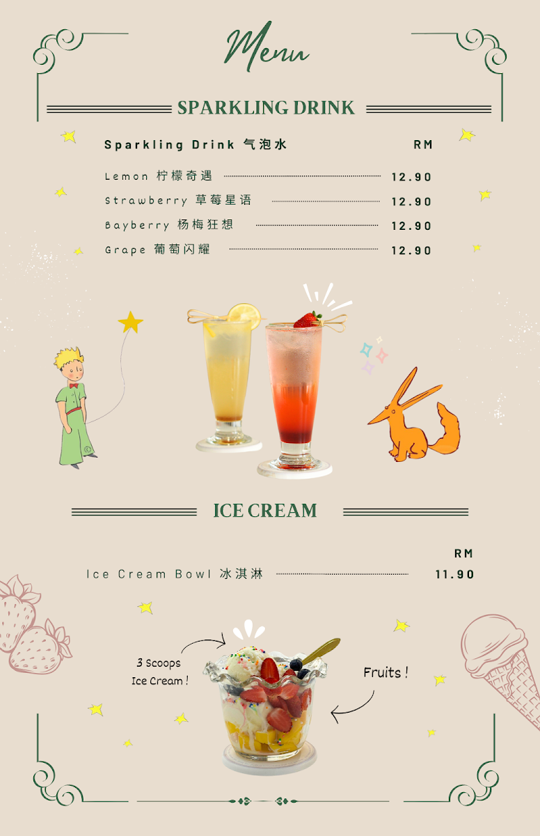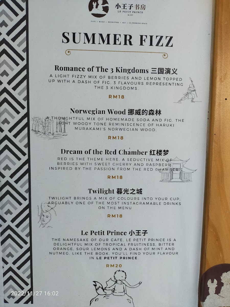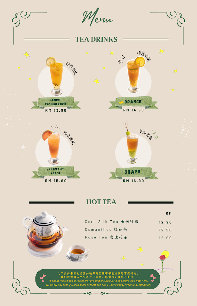 Le Petit Prince Book Cafe offers a cozy and inviting dining experience, where the menu is as charming as its atmosphere. A must-try is their Coffee, which perfectly complements the cafe's relaxing ambiance, providing a rich and satisfying taste for coffee lovers. For a heartier option, the 油焖鸡 (Braised Chicken with Oil and Soy Sauce) stands out as a flavorful, aromatic dish, bringing a delightful depth of taste with tender chicken cooked to perfection in a savory sauce. The menu also features a variety of other options that cater to different tastes, ensuring a satisfying experience for all visitors. Whether you're looking for a light snack or a full meal, Le Petit Prince Book Cafe offers a thoughtful selection of dishes that pair well with its literary-themed setting, making it a perfect spot for both food and book enthusiasts alike.